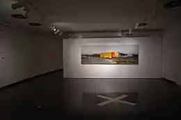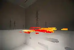 A year later, in November 2016, the series was exhibited at the exhibition Mall. The Time of Colorful Sheds was organized as part of the Non-Places Programme run by the Department of Research Art and hosted by the Smena Center of Contemporary Culture in Kazan. In 2015, Otdelnov's contemplations on the notion of glitches in the post-Soviet landscape were presented at two other exhibition projects. In July 2015, he made a total installation for the exhibition Piece of Space Traversed by Mind at the New Wing of Gogol Museum on Nikitsky Boulevard: he painted a monochrome landscape on the walls with a snow field, gray sky, and power transmission line pylons, and the "glitch" was manifested in Lego bricks suspended on thin wire. In 2015, Otdelnov also participated in Expanding Space. Art Practices in the Urban Environment, a project aimed at creative exploration of contemporary phenomena and features of Moscow, organized by V-A-C Foundation. Otdelnov proposed a large-scale object constructed with bright composite panels to be installed next to the Moscow Ring Road near the 81st kilometer. It employed the parallax effect to make the structure seem stably whole from one vantage point but, as the perspective shifts, to disintegrate into parts becoming fluid and unstable. This piece was meant to imitate abandoned or uncompleted mall projects that look like a disruption in the landscape and, at the same time, symbolize the volatility in the economy.[40][41][42][43][44][45]