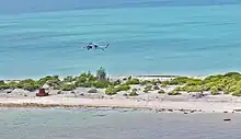Peale is on the north-west side of Wake Island, and major points on Peale include Toki Point, which is the western cape of Peale. On the southern side there is an extension of land into the lagoon which points south-east and ends at Flipper Point.[3] It is separated from Wake Island by a channel which, from World War II to the 21st century, was crossed by a wooden bridge. The bridge had burned down by 2003. In 1953 the bridge between Peale and Wake Island was rebuilt.[4]