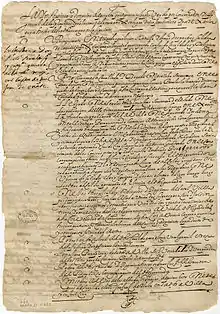 According to one source, Don Pedro de Peralta was a bachelor of canon law. A report of possessions found in his house after his arrest includes a law book.[3] Peralta was appointed governor of New Mexico by the Viceroy, Luis de Velasco, marqués de Salinas on 31 March 1609, shortly after Peralta had arrived from Spain.[4] Juan de Oñate had asked Velasco for compensation for his efforts in New Mexico, and asked that his son Christóbal be allowed to succeed him. Valasco replied that he had named Peralta as governor, and that Onate should hand over to him when he arrived at the Rio Grande and should then return with his son to Mexico City without delay.[5] An expedition with supplies and reinforcements left for the north late in 1609. Peralta reached the capital, La Villa de San Gabriel, early in 1610. He was met by Oñate, who left for the south in early February to face charges of maladministration.[6] Peralta brought twelve soldiers and eight Franciscan priests with him.[2] His instructions included searching for the Straits of Anián,[lower-alpha 1] on which he should establish a secure port.[8]