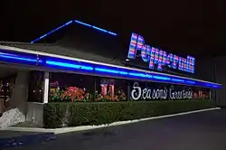 The interior originally featured orange and brown colors, and wagon-wheel lamps above the tables. The color scheme would later become maroon and mauve,[6] before settling on the current design.[29] The restaurant's artificial cherry blossoms, added in the 1990s, came from the former Peppermill resort in Mesquite, Nevada.[6] Kitchen upgrades and new carpeting, with the same design, were added in 2014.[30] A new roadside sign was also added four years later, but the property's design has otherwise remained the same.[31]