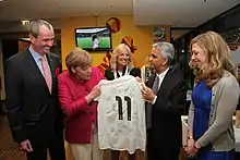 Murphy served as United States Ambassador to Germany under President Barack Obama from 2009 to 2013.[29] The possibility of his being named to the post was first reported by Spiegel Online International in May 2009.[24] The former U.S. Ambassador John Kornblum supported the choice, saying, "Murphy has been involved in German-American relations for many years. He's a good choice."[24] An agrément was issued,[30] and Obama formally nominated him to the position on July 9.[31] Murphy was confirmed by the United States Senate on August 7,[20] and appeared with his family in Berlin on August 21.[32] That they arrived in an expensive Gulfstream V executive jet irked Chancellor Merkel, who saw it as evidence of the long practice of presidents awarding wealthy donors with ambassadorships.[16][31] Murphy presented his credentials in Berlin to German President Horst Koehler on September 3,[33] which the State Department considers his effective start date.[34] He was sworn into the position on September 13.[31]