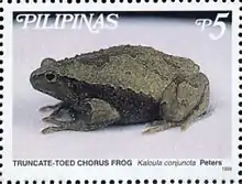 The Philippine narrowmouth toad or the truncate-toed chorus frog (Kaloula conjuncta) is a species of frog in the family Microhylidae. It is endemic to the Philippines. Its natural habitats are subtropical or tropical dry forests, subtropical or tropical moist lowland forests, subtropical or tropical moist shrubland, subtropical or tropical seasonally wet or flooded lowland grassland, rivers, intermittent rivers, freshwater lakes, intermittent freshwater lakes, freshwater marshes, intermittent freshwater marshes, arable land, pastureland, plantations, rural gardens, heavily degraded former forest, water storage areas, ponds, irrigated land, and seasonally flooded agricultural land. It is threatened by habitat loss.[2]