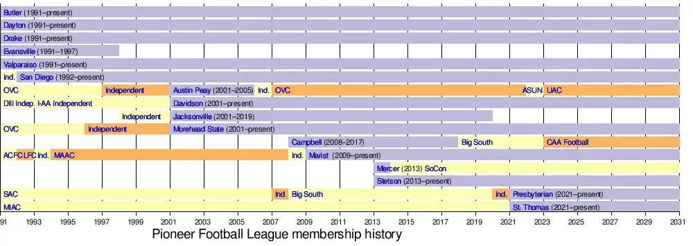 Following an NCAA rule change passed in January 1991, which required Division I schools to conduct all sports at the Division I level by 1993, the conference was formed by charter members Butler University, the University of Dayton, Drake University, the University of Evansville, and Valparaiso University.[1] The University of San Diego joined in 1992, and the league played its first season in 1993. The six original schools which played in the 1993 season had previously sponsored football at the Division I, Division II and Division III levels.