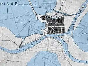 The most believed hypothesis is that the origin of the name Pisa comes from Etruscan and means 'mouth', as Pisa is at the mouth of the Arno river.[5]