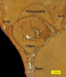 Platyceratids are known for the complex symbiotic relationships they had with crinoids.[3] Platyceratids are thought to have been parasitic on crinoids, either drilling into the stomach to steal the crinoid's food in a form of kleptoparasitism or drilling into the anal sac to feed on the gonads or the hindgut.[3][4] Previous authors have suggested that platyceratids were commensalists which fed on crinoid fecal matter without harming the crinoid, but more recent studies have shown that platyceratids did have a negative effect on their crinoid hosts as would be expected if they were actively parasitic.[5] It has been suggested that the large spines present on many species of crinoids served to deter predators who might damage or harm the crinoid in an effort to feed on the platyceratid snails infesting it.[4]