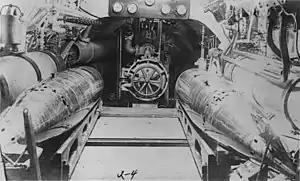 A 1912 view of the breech of the sole torpedo tube of USS Moccasin / A-4. Two torpedoes are on wooden skids in the foreground. The skids slid across the deck for loading.