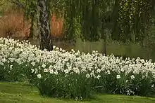 The Renaissance mythographer Natale Conti says wreaths of narcissus, maidenhair fern (adianthus), and cypress were given to Pluto.[104] In the Homeric Hymn to Demeter, Gaia (Earth) produced the narcissus at Zeus's request as a snare for Persephone; when she grasps it, a chasm opens up and the "Host to Many" (Hades) seizes her.[105] Narcissus wreaths were used in early times to crown Demeter and Persephone, as well as the Furies (Eumenides).[106] The flower was associated with narcotic drugginess (narkê, "torpor"),[107] erotic fascination,[108] and imminent death;[109] to dream of crowning oneself with narcissus was a bad sign.[110] In the myth of Narcissus, the flower is created when a beautiful, self-absorbed youth rejects sexuality and is condemned to perpetual self-love along the Styx.[111]