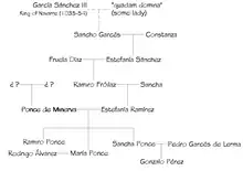 Family tree showing Ponce's relationship, through his wife, to the royal house of Navarre, and the marriages and descendants of his children.