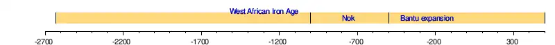 The Nok peoples and the Gajiganna peoples may have migrated from the Central Sahara, along with pearl millet and pottery, diverged prior to arriving in the northern region of Nigeria, and thus, settled in their respective locations in the region of Gajiganna and Nok.[32] Nok culture may have emerged in 1500 cal BCE and continued to persist until 1 cal BCE.[32] Nok people may have developed terracotta sculptures, through large-scale economic production,[73] as part of a complex funerary culture[74] that may have included practices such as feasting.[32] The earliest Nok terracotta sculptures may have developed in 900 BCE.[32] Some Nok terracotta sculptures portray figures wielding slingshots, as well as bows and arrows, which may be indicative of Nok people engaging in the hunting, or trapping, of undomesticated animals.[75] A Nok sculpture portrays two individuals, along with their goods, in a dugout canoe.[75] Both of the anthropomorphic figures in the watercraft are paddling.[76] The Nok terracotta depiction of a dugout canoe may indicate that Nok people used dugout canoes to transport cargo, along tributaries (e.g., Gurara River) of the Niger River, and exchanged them in a regional trade network.[76] The Nok terracotta depiction of a figure with a seashell on its head may indicate that the span of these riverine trade routes may have extended to the Atlantic coast.[76] In the maritime history of Africa, there is the earlier Dufuna canoe, which was constructed approximately 8000 years ago in the northern region of Nigeria; as the second earliest form of water vessel known in Sub-Saharan Africa, the Nok terracotta depiction of a dugout canoe was created in the central region of Nigeria during the first millennium BCE.[76] Latter artistic traditions of West AfricaBura of Niger (3rd century CE – 10th century CE), Koma of Ghana (7th century CE – 15th century CE), Igbo-Ukwu of Nigeria (9th century CE – 10th century CE), Jenne-Jeno of Mali (11th century CE – 12th century CE), and Ile Ife of Nigeria (11th century CE – 15th century CE) – may have been shaped by the earlier West African clay terracotta tradition of the Nok culture.[77] Mountaintops are where the majority of Nok settlement sites are found.[78] At the settlement site of Kochio, the edge of a cellar of a settlement wall was chiseled from a granite foundation.[78] Additionally, a megalithic stone fence was constructed around the enclosed settlement site of Kochio.[78] Also, a circular stone foundation of a hut was discovered in Puntun Dutse.[79] Iron metallurgy may have been independently developed in the Nok culture between the 9th century BCE and 550 BCE.[32][80] As each share cultural and artistic similarity with the Nok culture found in Nok, Sokoto, and Katsina, the Niger-Congo-speaking Yoruba, Jukun, or Dakakari peoples may be descendants of the Nok peoples.[81] Based on stylistic similarities with the Nok terracottas, the bronze figurines of the Yoruba Ife Empire and the Bini kingdom of Benin may also be continuations of the traditions of the earlier Nok culture.[82]