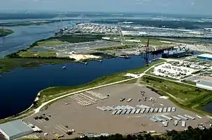 The Port of Jacksonville (JAXPORT) is an international trade seaport on the St. Johns River in Jacksonville, Florida. JAXPORT is the largest port by volume in Florida, and the 14th largest container port in the United States.[3] It carries about 18 million short tons of cargo each year[4] and has an annual economic impact of over $31 billion, including 138,500 jobs across the state of Florida related to cargo moving through the port.[5] It handled 1,338,000 containers, and is the second largest handler of vehicles in the United States with 696,500 in 2019.[6]