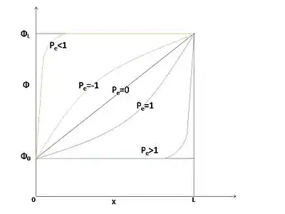 The variation between and x is depicted in Figure for a range of values of the Peclet number. It shows that for large Pe, the value of at x=L/2 is approximately equal to the value at upwind boundary which is assumption made by the upwind differencing scheme. In this scheme diffusion is set to zero when cell Pe exceeds 10.