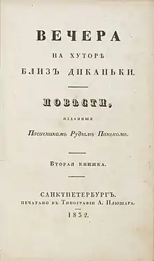 Evenings on a Farm Near Dikanka (Russian: «Вечера на хуторе близ Диканьки») is a collection of short stories by Nikolai Gogol, written in 1829–1832. They appeared in various magazines and were published in book form when Gogol was twenty-two. The collection's frame story takes place in Dykanka, a settlement in central Ukraine.