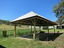 The Queensland education system recognised the importance of play in the school curriculum and, as school sites were typically cleared of all vegetation, the provision of all-weather outdoor space was needed. Playsheds were designed as free-standing shelters, with fixed timber seating between posts and earth or decomposed granite floors that provided covered play space and doubled as teaching space when required These structures were timber-framed and generally open sided, although some were partially enclosed with timber boards or corrugated galvanised iron sheets.[15] The hipped (or less frequently, gabled) roofs were clad with timber shingles or corrugated iron. Playsheds were a typical addition to state schools across Queensland between c.1880s and the 1950s, although less frequently constructed after c.1909, with the introduction of highset school buildings with understorey play areas. Built to standard designs, playsheds ranged in size relative to student numbers.[16] In 1910, a six-post timber playshed with a hipped roof was built at Prenzlau State School by C Ridsdale of Rosewood for £36.10s. Pupil numbers in this period averaged more than 50 per day.[17] The playshed was a characteristic example of a six-post type, with light timber framing.[18][1]
