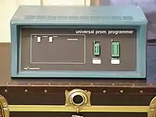 A programmer, device programmer, chip programmer, device burner,[1]:364 or PROM writer[2] is a piece of electronic equipment that arranges written software or firmware to configure programmable non-volatile integrated circuits, called programmable devices.[3]:3 The target devices include PROM, EPROM, EEPROM, Flash memory, eMMC, MRAM, FeRAM, NVRAM, PLDs, PLAs, PALs, GALs, CPLDs, FPGAs, and microcontrollers.