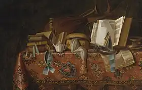 Pseudo-Roestraten or Pseudo-Roestraeten is the notname given to an artist or artists to whom or which are attributed a number of vanitas still lifes likely created in the period between 1675 and 1725. The notname was given as the artist's works show some resemblance to that of the Dutch painter Pieter Gerritsz van Roestraten. Recurring elements of the paintings are arrangements of books, documents and precious objects with a vanitas meaning displayed on oriental carpets. The artist(s) may have been of German or Scandinavian origin.[1] Many works of the anonymous artist are or were held in English collections, which makes it likely that the artist worked for some time in England.[2]