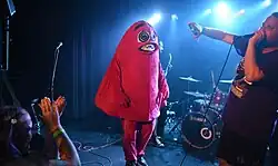 Purple City mascot Nurple joins the hardcore band Vibes on stage at Temple, 25 August 2023.