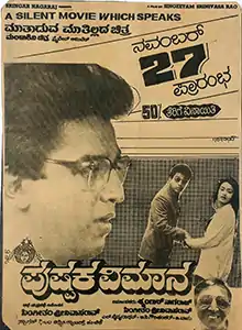 Pushpaka Vimana was released on 27 November 1987.[28] The film was released under different titles for different linguistic regions: its original title Pushpaka Vimana in Karnataka (in the Kannada language), Pushpaka Vimanam in Andhra Pradesh (Telugu), Pushpak (transl.Flower) in Hindi-speaking regions, Pesum Padam (transl.Talking Picture) in Tamil Nadu (Tamil), and Pushpakvimanam in Kerala (Malayalam).[11][29] In Andhra Pradesh, it was distributed by Sravanthi Ravi Kishore, in Mumbai by actor Rajendra Kumar,[11] and in Madras by editor A. Mohan.[30] The film was featured in the Indian Panorama section at the 12th International Film Festival of India.[31] Retrospectively it was featured in the Shanghai International Film Festival, and Whistling Woods Film Festival.[32][33]