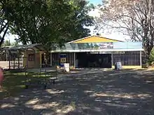 Quepos Airport terminal building, holding the Nature Air and Sansa ticket counters, along with restrooms, a snack stand/bar, and a Costa Rican departure tax stand.