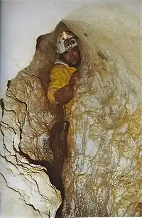 The downstream passages and the upstream passages and median networks were connected through the master cave, by the Grenoble Cavers of the French Alpine Club (SGCAF) in 2008, by pushing the boulder chokes, making it the second 1,000-metre (3,300 ft) deep system in the Vercors.[3]