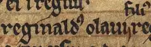 Rǫgnvaldr Óláfsson's name as it appears on folio 47r of British Library Cotton Julius A VII (the Chronicle of Mann): "Reginaldus Olavi filius".[1]
