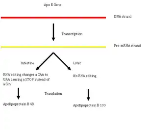 The editing involves cytidine deaminase that deaminates a cytidine base into a uridine base. An example of C-to-U editing is with the apolipoprotein B gene in humans. Apo B100 is expressed in the liver and apo B48 is expressed in the intestines. In the intestines, the mRNA has a CAA sequence edited to be UAA, a stop codon, thus producing the shorter B48 form. C-to-U editing often occurs in the mitochondrial RNA of flowering plants. Different plants have different degrees of C-to-U editing; for example, eight editing events occur in mitochondria of the moss Funaria hygrometrica, whereas over 1,700 editing events occur in the lycophytes Isoetes engelmanii.[47] C-to-U editing is performed by members of the pentatricopeptide repeat (PPR) protein family. Angiosperms have large PPR families, acting as trans -factors for cis -elements lacking a consensus sequence; Arabidopsis has around 450 members in its PPR family. There have been a number of discoveries of PPR proteins in both plastids and mitochondria.[48]