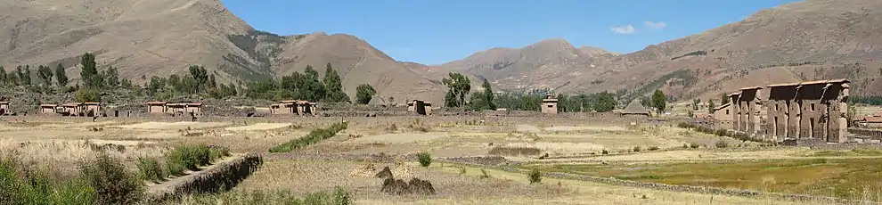 The Inka site at Raqch'i was a primary control point on a road system that originated in Cusco and expanded as the Inka empire grew. It is located in a valley known for sacred sites.[6] Most of the Inka structures are enclosed by a 4 km-long perimeter wall, but just outside it, on the Inka road that entered Raqch'i from Cusco, an enclosure with eight rectangular buildings around a large courtyard was probably a tampu (a lodging house for travellers).[7] The administrative records from around the same time as the site indicate that this was in all likelihood such a place.[8] The complex of Raqch'i consists of several different areas each designated with a specific function. Some have noted that these buildings may have been for religious and administrative officials.[8] Others speculate that these buildings, paired with the scale of defenses may have been used as barracks to house troops.[8] Nearby are approximately 220 circular buildings, likely used as storehouses, called qullqas.[8] On the nearby hillsides are irrigated terraces which were likely used to keep the qullqas full for those traveling through.[8] Raqch'i also houses a nearby spring and a pool or bath in proximity to the Temple of Wiracocha which could have been used for rituals.[8] It has also been mentioned that because of the dual religious and administrative purposes, that the Sun cult might have held the surrounding lands to keep llamas for sacrifice like a similar site called Mayobamba.[8]