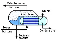 Kettle reboilers (Image 1) are very simple and reliable. They may require pumping of the column bottoms liquid into the kettle, or there may be sufficient liquid head to deliver the liquid into the reboiler. In this reboiler type, steam flows through the tube bundle and exits as condensate. The liquid from the bottom of the tower, commonly called the bottoms, flows through the shell side. There is a retaining wall or overflow weir separating the tube bundle from the reboiler section where the residual reboiled liquid (called the bottoms product) is withdrawn, so that the tube bundle is kept covered with liquid and reduce the amount of low-boiling compounds in the bottoms product.