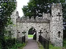In 1777 a mock medieval gateway was built over the ruins of the original castle. An inscription is written on the side of the gateway, in English on one side and Latin on the other: