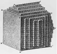 Between 1784 and 1822, Haüy published more than 100 reports discussing his theories and their application to the structure of crystalline substances.[4]:85 Haüy first stated his laws of decrement in Essai d'une théorie sur la structure des crystaux (1784). It was a radical departure from his previous works, introducing his theory of molé constituantes or constituent molecules.[5]:322 By 1792, he had identified a number of parallelepipeds as possible primitive crystal forms.[5]:326 Haüy worked out the mathematical theory of his work in his Traité de minéralogie (1801), which became a classic in the field.[6] By then, Haüy had applied his ideas to the differentiation of different species. He systematically described all the known minerals, sorting them into classes, and giving their chemical and geometrical properties.[5]:328 His work, in four volumes, including an atlas of plates, was accounted among the most wonderful of the 19th century.[6]:2 It has been described as "a work of comprehensive insight, and much of it, written with literary fluency".[10] A second updated edition appeared as Traité de cristallographie in 1822.[5]:328