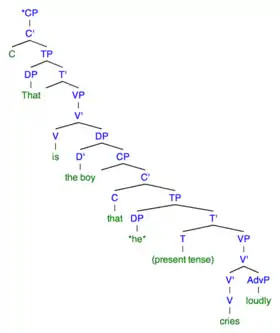 Sentence 3B: This syntactic tree of the sentence "*That is the boy that he cries loudly" demonstrates the structure when there is resumptive pronoun used. To denote a null category, "ø" is used. the "*" marks an ungrammatical sentence.