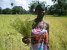 A rice farmer in the Casamance (southern Senegal) showing R. fistulosa invading her crop; Photo: J. Rodenburg (AfricaRice).