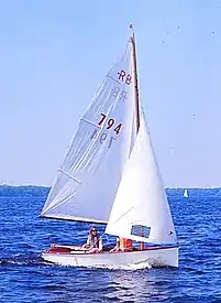 The Rhodes Bantam is a strict one-design class sailboat designed by Philip Rhodes in 1945. The first boat was launched in 1945 in Skaneateles.[1] More than 1500 have been built.[2][3][4][5] It can be used for day sailing and will comfortably hold 2 adults and 2 children. It is also used for racing, usually with a crew of two. Originally it was built of wood and could be purchased either complete, or as a kit.[6] In the 1960s, when fiberglass gained popularity as a hull material, it became possible to buy either a fiberglass hull kit or a finished boat. The Bantam may be classified as a centreboard dinghy. In addition to the mainsail, it typically has a genoa jib and spinnaker. It uses a centerboard for stability. It has a hard chine line which permits planing when on a beam reach or when sailing downwind with spinnaker. The class was very popular in the 1950s and 1960s. Active fleets existed in the Finger Lakes Region (e.g. Cuyuga Lake, Skaneateles Lake), Pennsylvania, Ohio, the Midwest and even Florida.[7] The Rhodes Bantam Class Association sponsored a yearly regatta which rotated through the home ports of various fleets.[8]