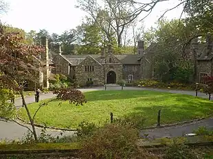 Ridley Creek State Park is a 2,606-acre (1,055 ha) Pennsylvania state park in Edgmont, Middletown,[3] and Upper Providence Townships, Delaware County, Pennsylvania in the United States. The park, about 5 miles (8 km) north of the county seat of Media, offers many recreational activities, such as hiking, biking, fishing, and picnicking. Ridley Creek passes through the park. Highlights include a 5-mile (8 km) paved multi-use trail, a formal garden designed by the Olmsted Brothers, and Colonial Pennsylvania Plantation, which recreates daily life on a pre-Revolutionary farm. The park is adjacent to the John J. Tyler Arboretum. Ridley Creek State Park is just over 16 miles (26 km) from downtown, Philadelphia between Pennsylvania Route 352 and Pennsylvania Route 252 on Gradyville Road.