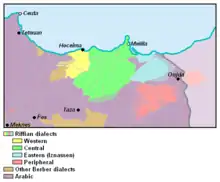Riffian is a Zenati Berber language[7] which consists of various sub-dialects specific to each clan and of which a majority are spoken in the Rif region, a large mountainous area of Northern Morocco, and a minority spoken in the western part of neighbouring Algeria.[8][9]