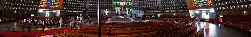 The New Cathedral, as it is sometimes called, is located in the center of the city. Conical in form and with a 96 metres (315 ft) internal diameter — 106 metres of external diameter — and an overall height of 75 metres (246 ft). Inside, the area measures 8,000 square meters and sufficient 5,000 seats(; it has a standing-room capacity of 20,000 people).