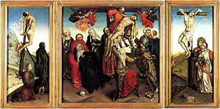 The Entombment Triptych (or "Seilern Triptych" Courtauld Institute, London) is dated to around 1425.[12] The central panel shows his debt to the sculpture of the time (Campin was known to have polychromed several statues). After this, he painted the Marriage of the Virgin (Museo del Prado, Madrid) and Nativity (Musée des Beaux-Arts de Dijon) around 1420–1425.