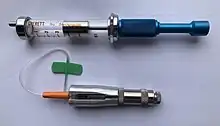 Upper: The Multiject designed for blind diabetics to self-administer precise doses of insulin. Lower: The Portaject wearable insulin infusion pump, shown with cannula attached.