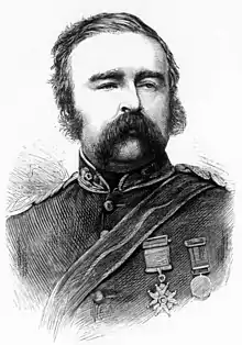 In 1873 he was selected by Sir Garnet (afterwards Lord) Wolseley to be the commanding Royal Engineer of the Ashantee expedition, and contemporary reports and historical appraisal alike speak favourably of his conduct in that "pre-eminently engineers' and doctors' campaign". According to Robert Hamilton Vetch, Home "proved himself as able in the field as at the desk, his energy and force of character enabling him to overcome manifold difficulties".[3] The work of opening a road from Cape Coast Castle, through the dense forest, preparing the way for the march to Coomassie, and providing huts to shelter the British troops at night in that pestilential climate, was performed by Major Home with remarkable ability and energy.[4][3] He was slightly wounded at the Battle of Amoaful, where he was in the extreme front. He was one of the first into and last out of Coomassie.[5]