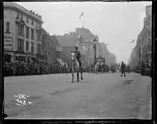 Young had the honour of leading New Zealand forces in the victory parade through London in May 1919, before leaving England on 11 July 1919 for demobilisation.[15] On arrival in New Zealand, Young was discharged from the NZEF on 21 October 1919, but chose to continue service with the Permanent Staff of the New Zealand Military Forces.[3]