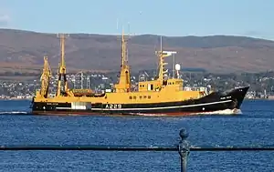 Dive tender Ilchester at Wick, Scotland, in 2004, on her way from Rosyth to Holyhead during the closure of the Caledonian Canal