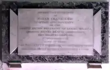 Sacred to the memory of Josiah Crane Esq., Captain and Adjutant of the North Devon Regiment of Local Militia. Colonel Henry Beavis, Commandant, who departed this life 7th December 1813 aged 77 years. This monument is erected by his brother officers as a small token of their respect and esteem.