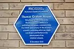 Recently (as of mid-August 2021) the RSC have listed plaques on their own website.[3] Currently that list omits the 2015 plaque for Robert Angus Smith below, but has the following additional plaques: four awarded later than the two 2016 plaques listed here, an extra 2006 plaque to Perkin, and a 1997 plaque relating to histamine H2-receptor antagonists. The RSC list has no inscriptions or photographs in contrast to this list, but it does have the precise date of the plaque award (whereas this list gives an approximate date of installation, normally some time after the award ceremony).