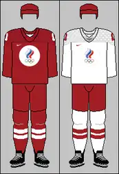 The Russian men's national ice hockey team (Russian: Сборная России по хоккею с шайбой) is the national men's ice hockey team of Russia, overseen by the Ice Hockey Federation of Russia. As of 2021, they were rated third in the IIHF World Ranking.[3] The team has competed internationally from 1992 until a 2022 ban, and is recognized by the IIHF as the successor to the Soviet Union team and CIS team. Russia has been one of the most successful national ice hockey teams in the world and a member of the so-called "Big Six," the unofficial group of the six strongest men's ice hockey nations, along with Canada, the Czech Republic, Finland, Sweden, and the United States.[4] The European nations of the Big Six participate in the Euro Hockey Tour, which Russia won nine times since 2005.[5] Since September 2021, the head coach is Alexei Zhamnov, who took over from Valeri Bragin.[6]