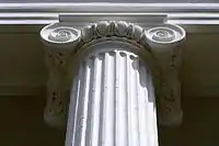 The cathedral is largely built of Oamaru limestone with brick facings. Designed by architect Francis Petre, with an axis of east–west rather than the west–east of its predecessor, Sacred Heart was built on a classical basilican plan. However, its portico of Ionic columns of Oamaru stone, whose pedestals rest on elongated plinths, and a high pediment closely reflect those of a Roman or Greek temple, and, in that respect, its most obvious model is the Maison Carrée, Nimes, which has full-length, Corinthian, columns. The building is within the classical proportions and forms a parallelogram (accommodating a clerestory with rows of arch-topped windows) of about 42 metres by 19 metres by a height of 18 metres. The main entrance is reached by means of a flight of seven steps. Out of the portico are three pairs of folding doors. The main pair in the centre give entrance directly to the church (originally, through a vestibule).[25] The frieze of the cathedral pediment carries the Latin inscription in gold letters: S.S. Cordi Jesu Dedicatum. A.D. MCMI which may be translated as "Dedicated to the Sacred Heart of Jesus. A.D. 1901."