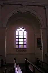 The Blessed Sacrament Chapel, built to the north, at right angles to the main axis of the building, can accommodate about 60 worshippers. The chapel houses five examples of fine English Victorian stained glass from the studios of the Atkinson Brothers given by the parish of St Joseph, Mt Victoria. They were first placed in the original, octagonal, St Joseph's church in Buckle St in 1885.[34] The central window is decorated with abstract designs. The other windows are of saints, two on each side. The saints are (on the left) Patrick and John and (on the right) Francis Xavier (with the notable astronomer Father David Francis Kennedy SM memorialised on this window) and, on the far right, St Peter. The windows " ... are a unique collection as no other building in the world contains more than two from these same workshops."[26] The modern glass above the chapel doors was designed and fabricated by Graham Stewart of Christchurch. There is also a fine icon of the Sacred Heart of Jesus and St Mary his mother by contemporary iconographer Michael Galovic (installed in 2007).[35]
