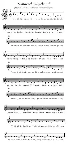 Saint Wenceslas Chorale (Czech: Svatováclavský chorál) or simply Saint Wenceslas is the church hymn and one of the oldest known Czech songs and Czech religious anthems. Its roots can be found in the 12th century and it belongs to the most popular religious songs also today, and to the oldest still used European chants. The hymn is mentioned as "old and well-known" in the chronicle from the 13th century.[1] Also strophic structure, language and undulating melody and harmonization confirm that assumption. The text of the song had originally three strophes. To the chant, originally in Old Czech, some new strophes have been added and also removed from over the centuries. Its final form becomes from the turn 18th and 19th century and in that version is still used today.
