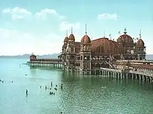 The SLGW was incorporated on September 6, 1891 as the Saltair Railway, with the express purpose of tapping the tourist market visiting the Saltair Beach Resort on the shores of the Great Salt Lake. It was reorganized as the Salt Lake & Los Angeles Railroad in April 1892, and renamed soon after the Salt Lake, Garfield & Western Railway. The line carried passengers to Saltair and freight to the mining area of Garfield, Utah including Morton Salt located on the shores of the Great Salt Lake. On June 8, 1893, the Saltair Resort was officially opened. Saltair was founded and owned originally by The Church of Jesus Christ of Latter-day Saints, but was later transferred to the railroad under the ownership of the Snow Family, and the railroad was sold to the Hogle family in the early 1960s.[1] For many years passenger traffic to the Saltair Resort was the line's biggest source of revenue. The line was electrified in 1916, a project that was completed in 1919. The Garfield Station was built approximately one mile from the Garfield town itself. Service to the Garfield station smelter industry ended in 1930, but continued to Morton Salt and other rail freight customers from Salt Lake City to the shores of the Great Salt Lake.[2] The railroad provided significant passenger tourist traffic, with trains of 12-16 passenger cars leaving to and from Saltair every 45 minutes. in 1933, the Great Salt Lake reached its lowest recorded levels, stranding the Saltair Beach Resort from the waterline. To make up for the loss of patronage due to the low water levels, a roller coaster was constructed, as well as a short railroad from the pavilion to the water using gasoline-powered speeders to carry patrons across the brine flat. in 1955, a fire consumed the bath houses; and in 1957 the roller coaster burned as well. The resort finally closed permanently in 1959, and the Salt Lake, Garfield & Western ceased passenger operations.[1] The first diesel locomotive on the line was purchased in 1951, and was a GE 44-tonner.[1] In July 1954 the railroad leased a GE centercab diesel from U.S. Steel, and this marked the end of electric operations on the Salt Lake, Garfield & Western.[3] The SLGW continues to haul freight to this day along its 16 miles of track with additional sidings for railcar storage, transloading, railcar cleaning, rail served warehousing and other rail-related services.