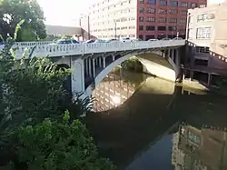 The San Jacinto Street Bridge is a viaduct which crosses Buffalo Bayou in Houston, Texas. The structure is listed on the National Register of Historic Places (NRHP). This bridge was built in 1914 to replace an iron pivot bridge of 1883 origin, and rehabilitated in 1997. It is a transportation conduit connecting downtown and the historical Fifth Ward.