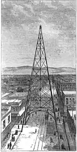 The San Jose electric light tower, also known as Owen's Electric Tower after its creator and chief booster, was constructed in 1881 at an intersection in downtown San Jose, California, as a "high light" or moonlight tower to light the city using arc lights. A pioneer use of electricity for municipal lighting, it was later strung with incandescent bulbs and was destroyed in a storm in December 1915. A half-size replica stands at History Park at Kelley Park.