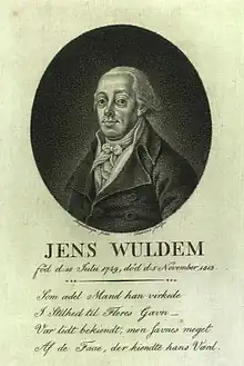 In October 1799, Pahlen sold the property to Jens Wulden. In 1797, Wuldem had returned to Copenhagen after spending most of his life in the Danish colonies. Born in Copenhagen on 18 July 1749, he had come to the Danish Gold Coast at the age of 12. He later continued to the Danish West Indies on board a slave ship. Aged 17, he was appointed as supercargo of a ship to China. He later completed two more journeys to China. He was later sent to Patna by the Danish Asiatic Company. In 1781, he was appointed as 1st Assistant at the Danish factory at Frederiksnagore. In 177475, he visited Copenhagen. During his stay in Copenhagen he was married to Anna Giessing with whom he in 1786 returned to Frederiksnagore. His wife died in 1793. In 1792, he succeeded Scavenius as 1st Factor in Frederiksnagore. In 1797, he moved back to Copenhagen. In 1811, he married his housekeeper (née Calussen). He died on 5 November 1813.[3]